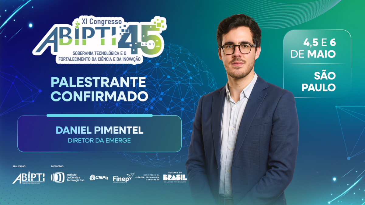 22/04/2026O XI Congresso ABIPTI confirmou a participação de Daniel Pimentel como palestrante no painel “Ecossistemas de Inovação Brasileiro”. O debate ocorre entre os dias 4 e 6 de maio, no espaço Villa Glam, em Moema, São Paulo. Cofundador e diretor da Emerge, Pimentel abordará os métodos de conexão entre a produção científica e o setor industrial, com ênfase em propriedade intelectual e na viabilização de tecnologias de base científica, conhecidas como deep techs, para o mercado.